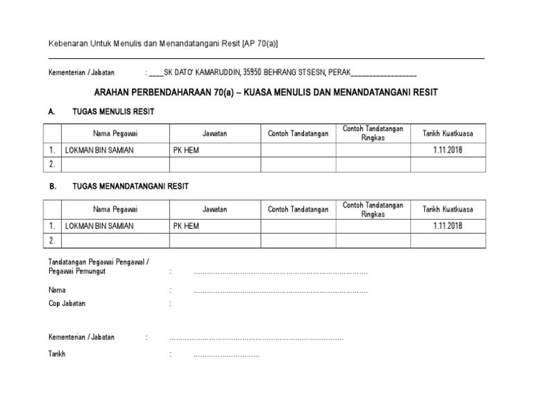 . Contoh Surat Kebenaran cute766 from cute766info. I Tugas mengutip dan menerima wang AP 69 ii Tugas menulis dan menandatangani resit AP 70a iii Tugas merekod pungutan AP 73 iv Tugas menyemak dan menandatangani buku tunai AP 80b v Tugas membatalkan. AP 158b Tanggungjawab Pegawai Pengawal Atas Pemulangan Deposit.